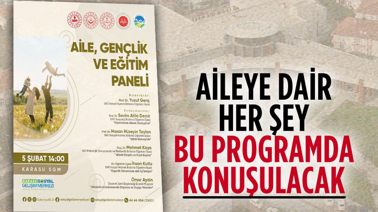 Dr.Öğr.Üyesi İhsan Kutlu “Ergenlik Döneminde Aile İçi İletişim” konusunu ele alırken, Diyanet İşleri Başkanlığı Emekli Müşaviri Ömer Aydın da “Ailelerde Kriz Esnasında Düşünce ve Duygu Yönetimi” başlığıyla sunum yapacak. Sakarya Büyükşehir Belediyesi Sosyal Hizmetler Dairesi Başkanlığı tarafından yapılan açıklamada, panele tüm vatandaşların davetli olduğunu bildirildi.