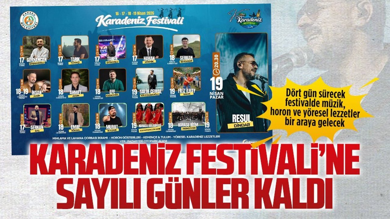 16-17-18-19 Nisan 2026 tarihleri arasında Karasu’da düzenlenecek olan Karadeniz Festivaline sayılı günler kaldı. Festival kapsamında sahne alacak sanatçılar ve etkinlik programı da netleşti. 17 Nisan Cuma günü Gökhan Can Boşnakoğlu, Tarık Tüfekçi, Taner Eyüpoğlu, Hakan Köntek sahne alarak festival coşkusunu başlatacak. Aynı gün 17.30’da Karasulu ses sanatçısı Serkan Baş’ta festivalde söyleyeceği şarkılarla kulakların pasını silecek.