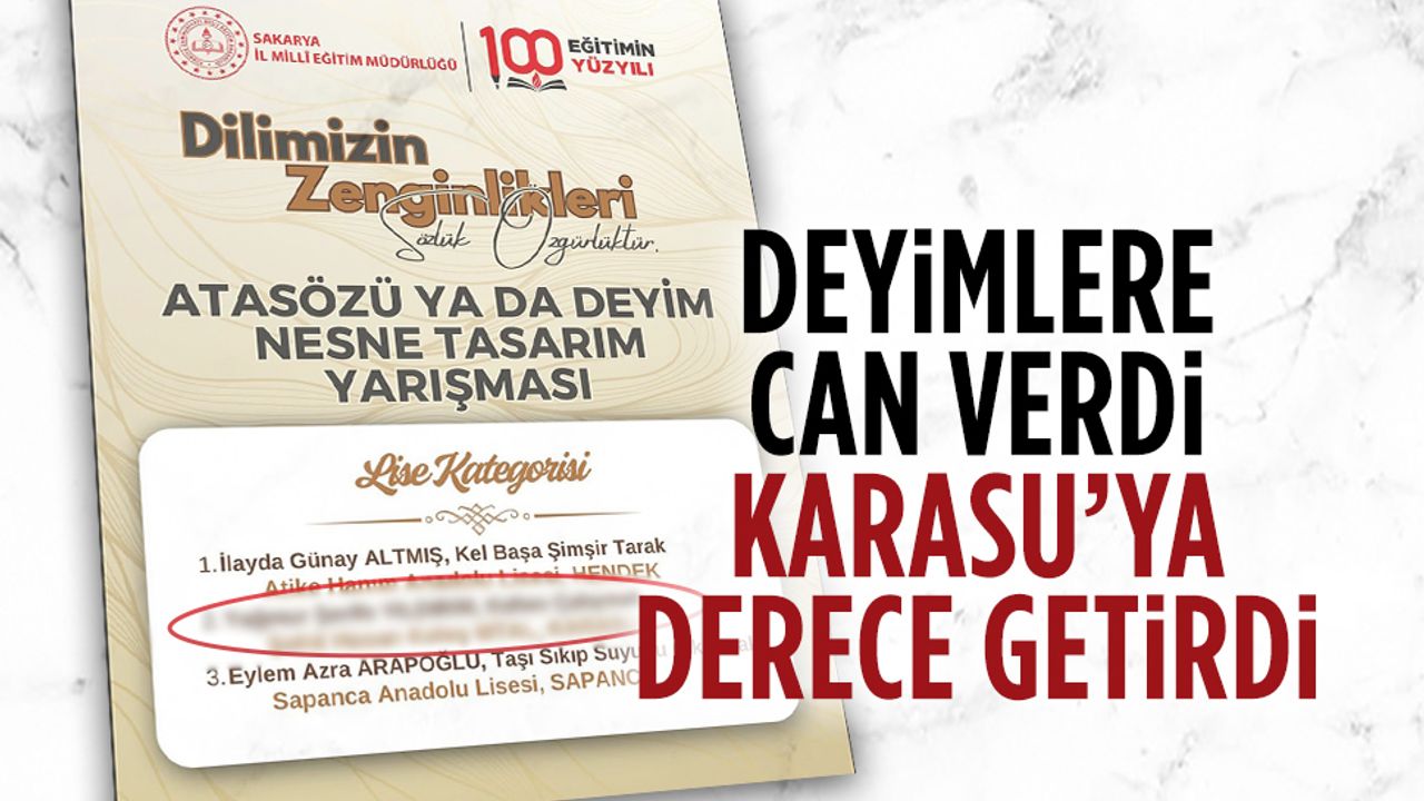 Sakarya İl Milli Eğitim Müdürlüğü tarafından düzenlenen “Dilimizin zenginlikleri” konulu Atasözü ya da deyim nesne tasarım yarışması sonuçları açıklandı. Yarışma kapsamında öğrenciler, Türkçenin derin kültürel birikimini somut tasarımlar aracılığıyla ifade etmeye teşvik edildi. Lise kategorisinde Karasu’dan Şehit Hasan Keleş Mesleki ve Teknik Anadolu Lisesi öğrencisi Yağmur Şerife Yıldırım, “Kafası Çalışmak” adlı tasarımıyla il genelinde ikinci oldu.