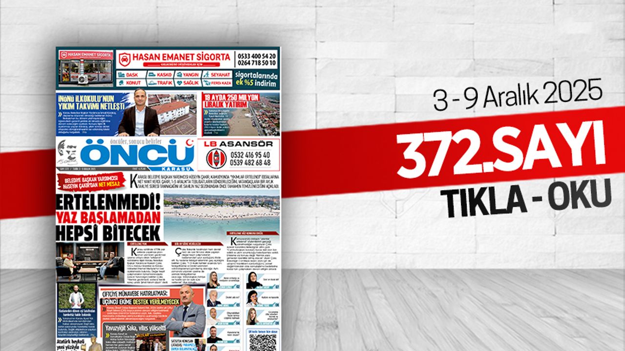 Öncü Karasu Gazetesi 372.sayı (3 - 9 Aralık 2025) tüm sayfalar. Gazeteyi dev boyutta, tam ekran okumak için sayfaların üzerine tıklayınız.
