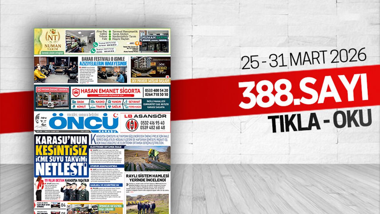 Öncü Karasu Gazetesi 388.sayı (25 - 31 Mart 2026) tüm sayfalar. Gazeteyi dev boyutta, tam ekran okumak için sayfaların üzerine tıklayınız.