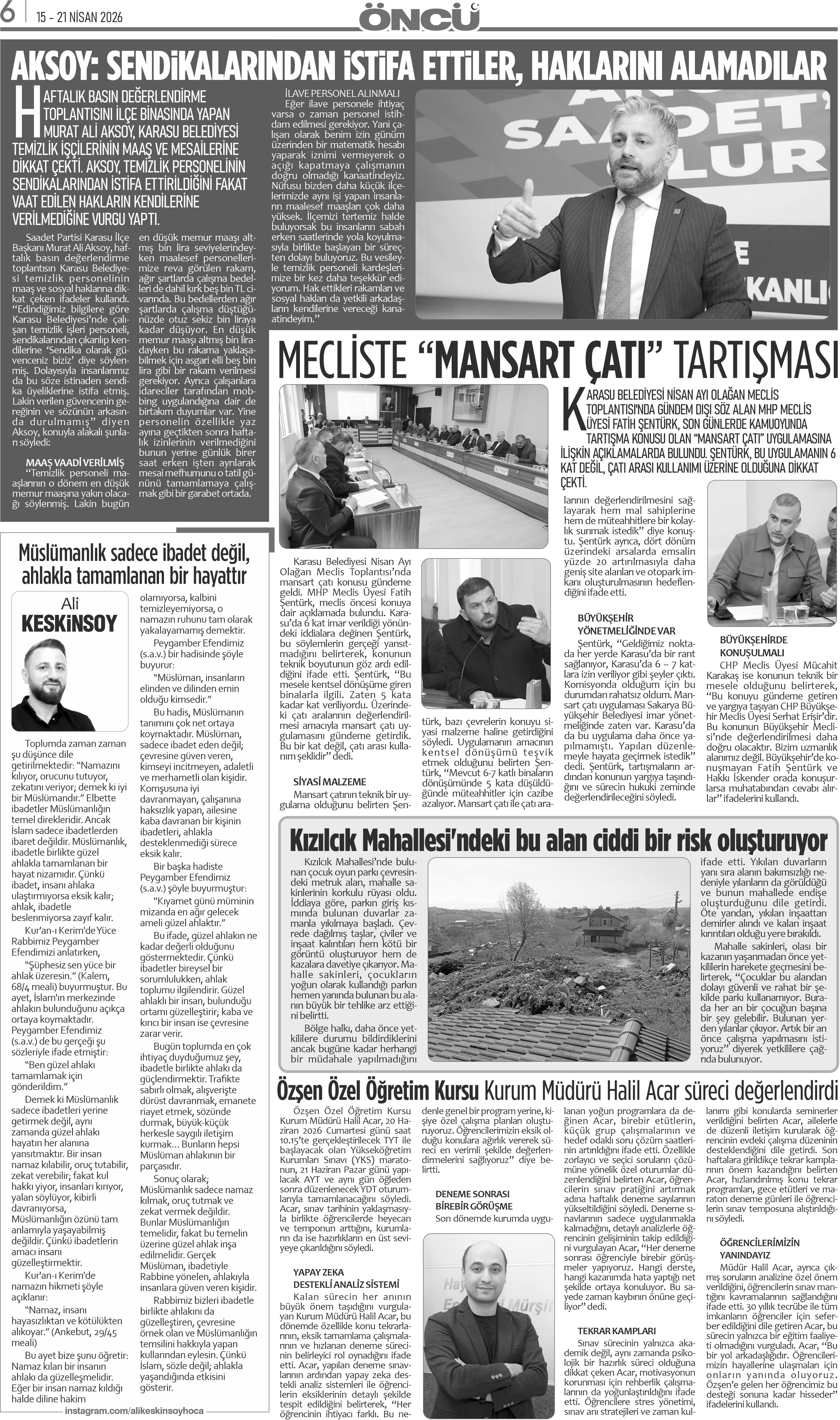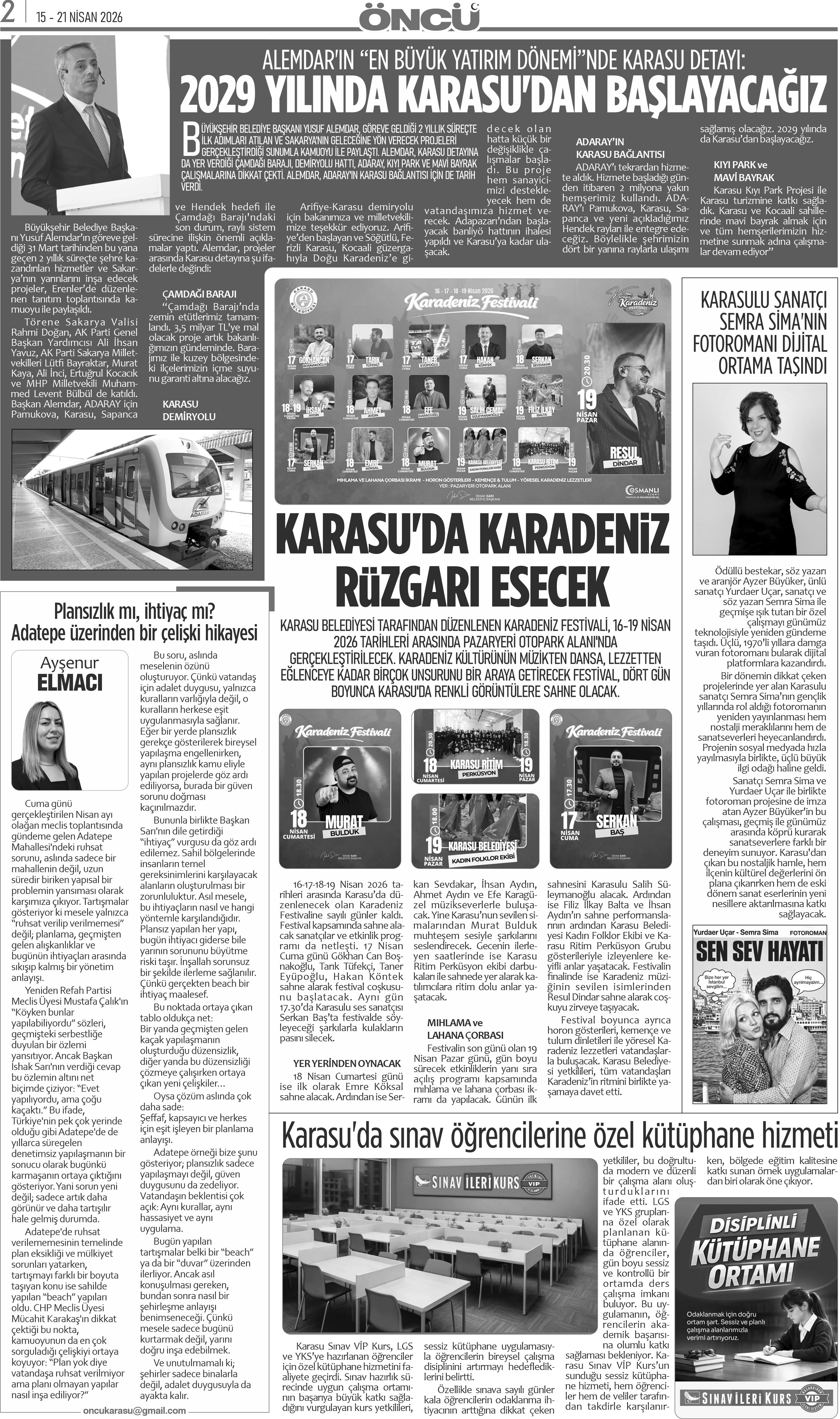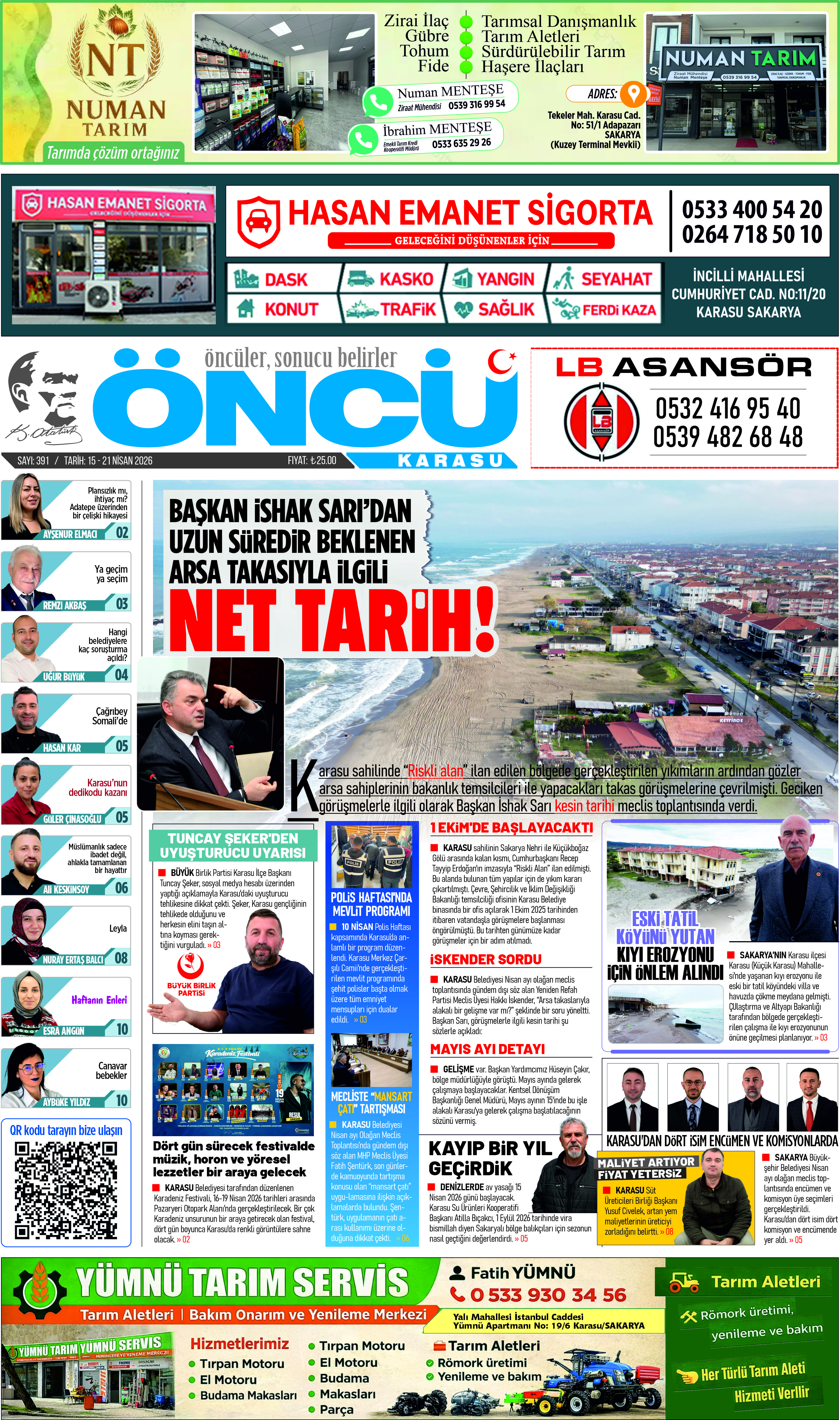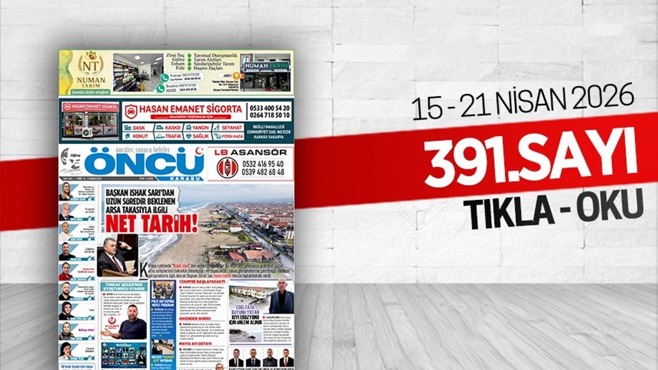 Öncü Karasu Gazetesi 391.sayı (15 - 21 Nisan 2026) tüm sayfalar. Gazeteyi dev boyutta, tam ekran okumak için sayfaların üzerine tıklayınız.