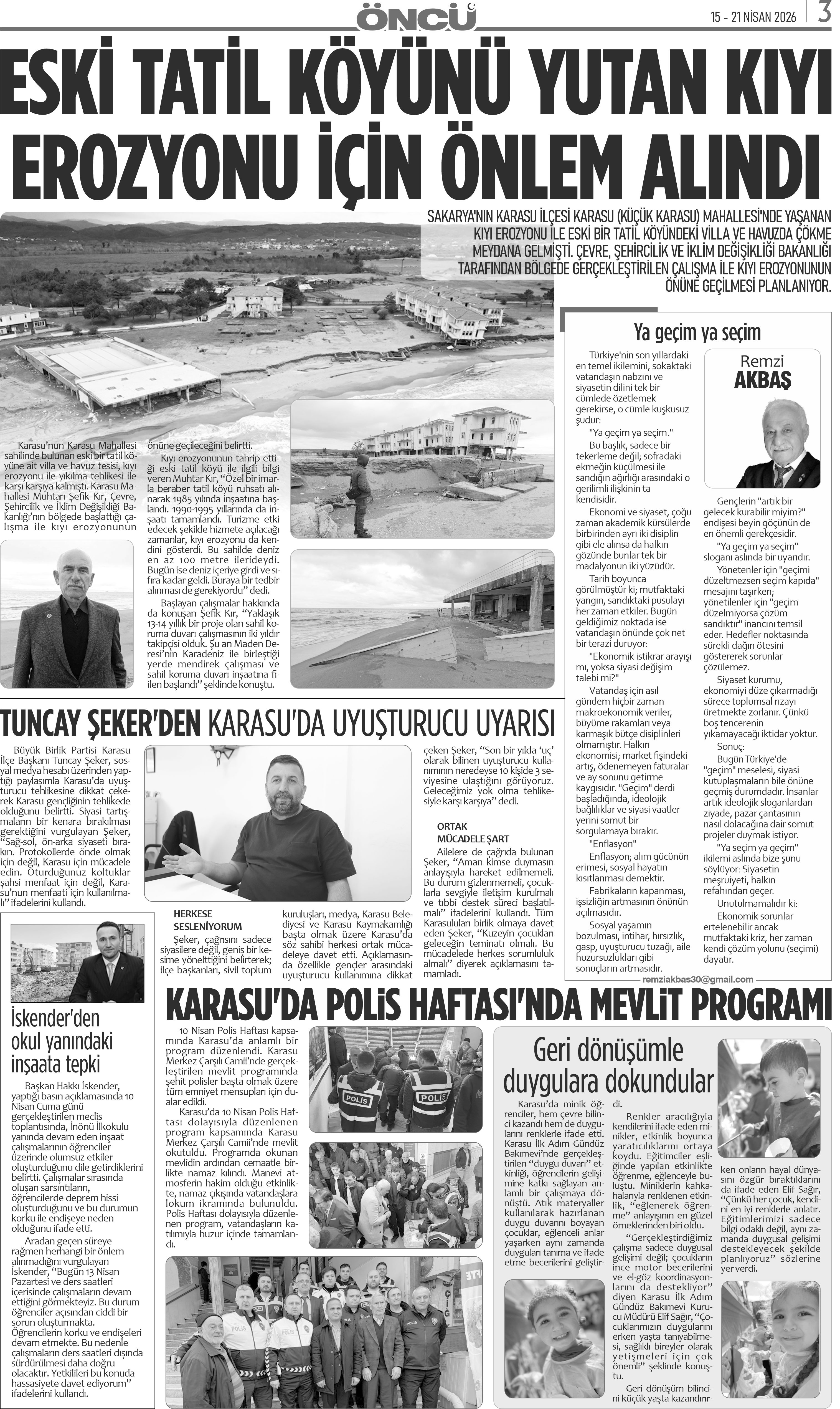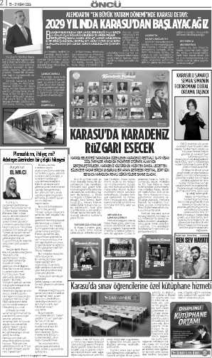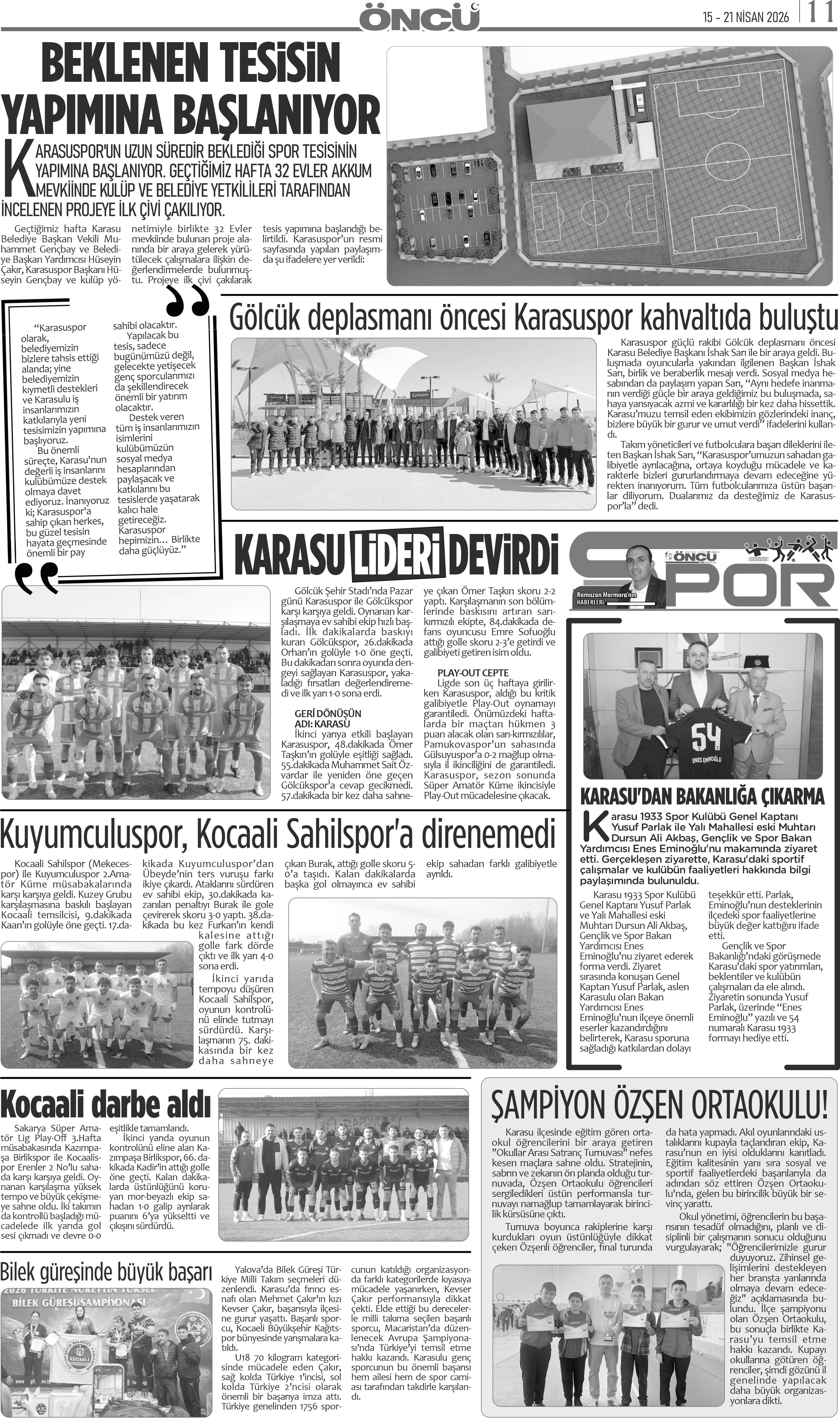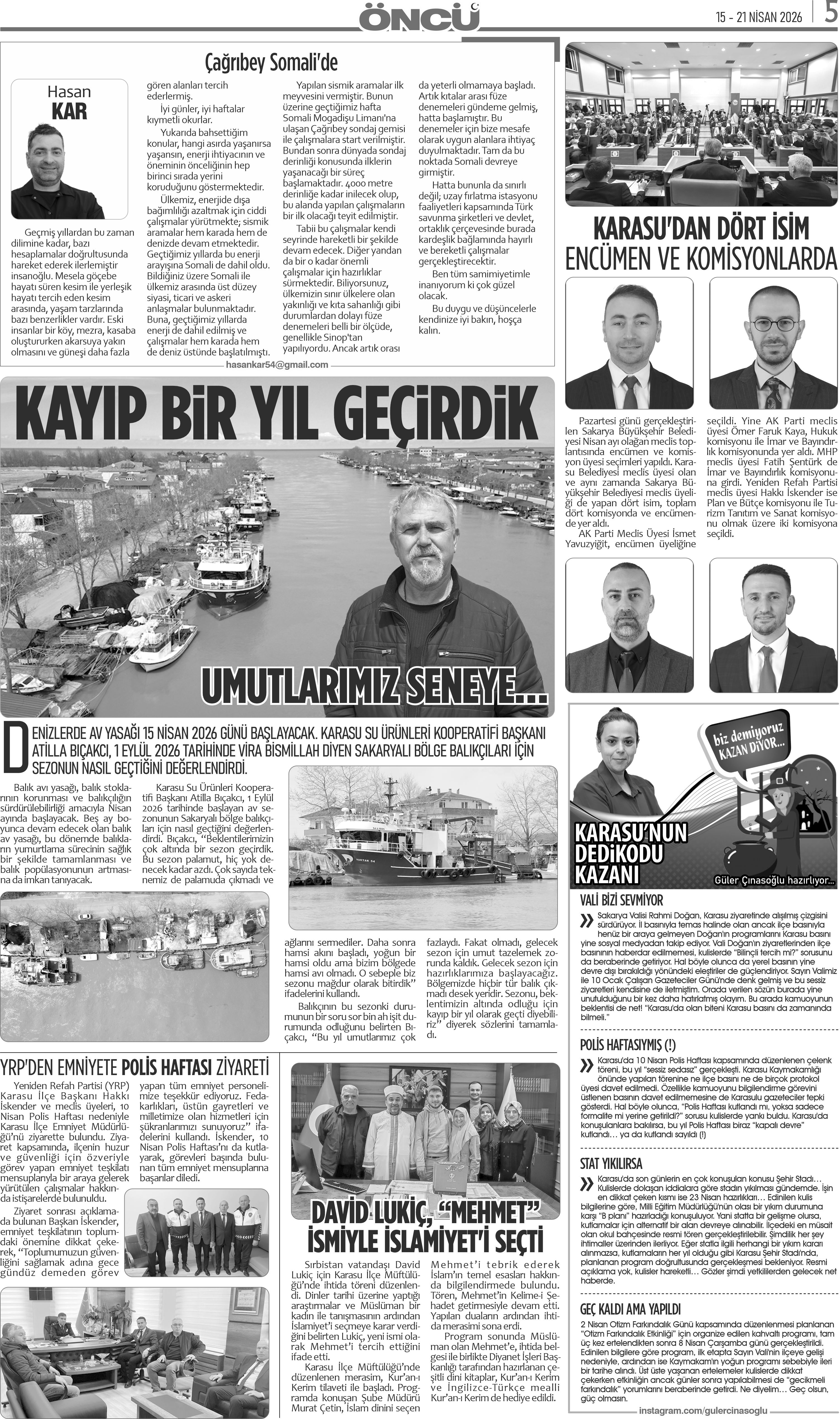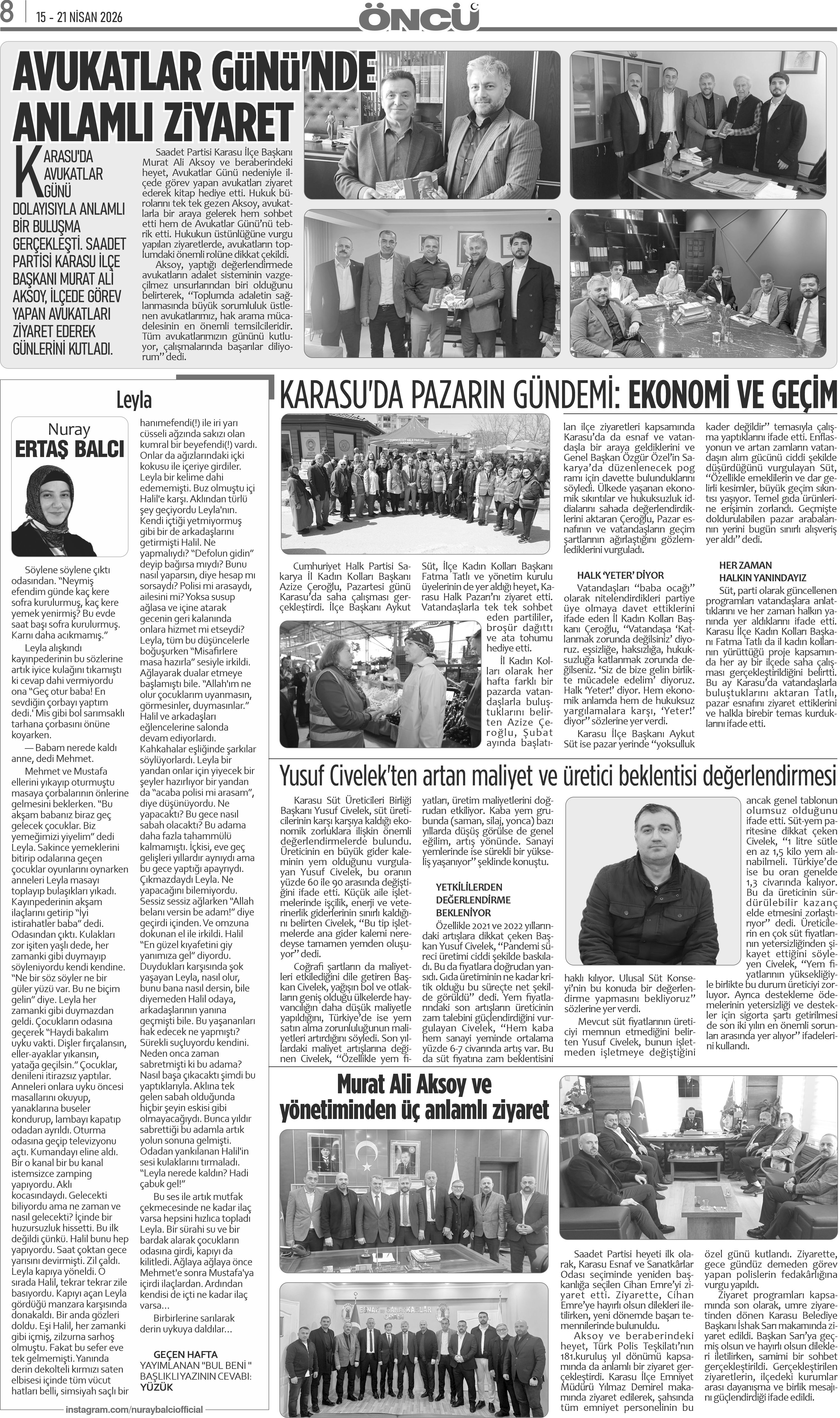 Öncü Karasu Gazetesi 391.sayı (15 - 21 Nisan 2026) tüm sayfalar. Gazeteyi dev boyutta, tam ekran okumak için sayfaların üzerine tıklayınız.